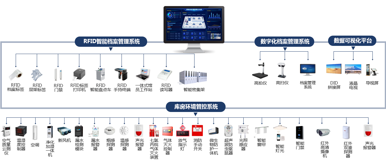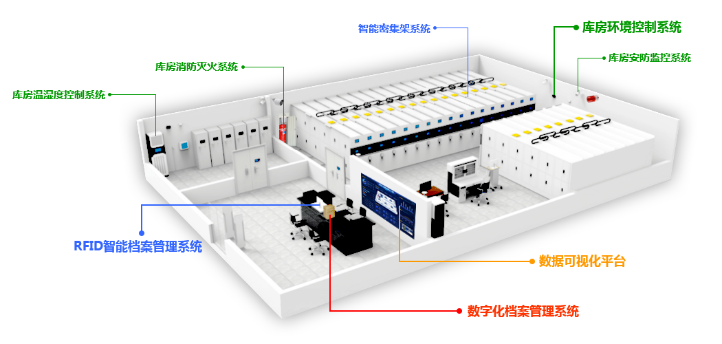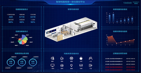 智慧檔案館的核心是智慧檔案一體化,平臺由數字化檔案管理系統、RFID智能檔案管理系統、庫房環境控制系統、數據可視化平臺四大系統構成,實現檔案庫房智能檔案管理、安防、消防、環控、數檔管理、數據可視化一體化綜合管理。